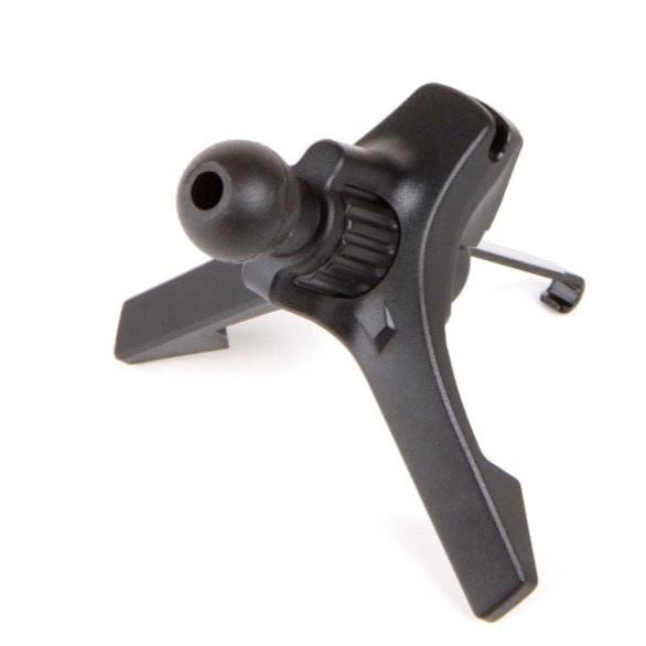 - Die Verbindung besteht aus einer Fixier-Manschette an der Rückseite des Q, die auf einer Positionier-Kugel geklemmt wird