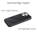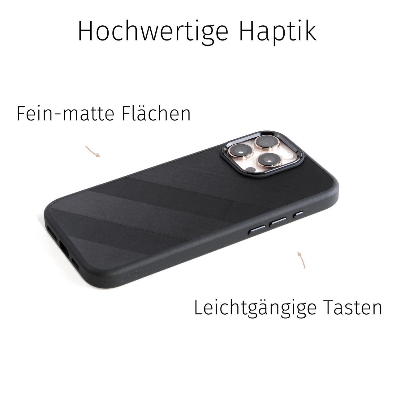 - Fein-matte Oberflächen, ähnlich wie das strukturierte iPhone Rückseitenglas, aber wärmer im Griff